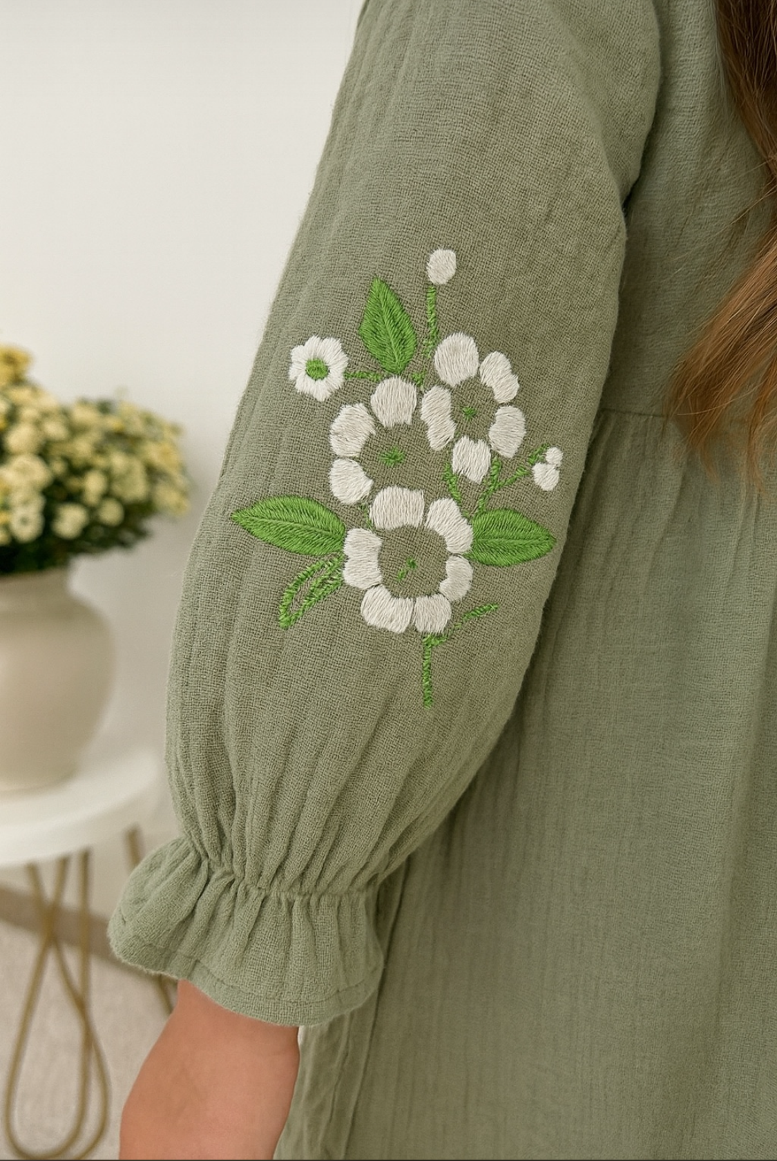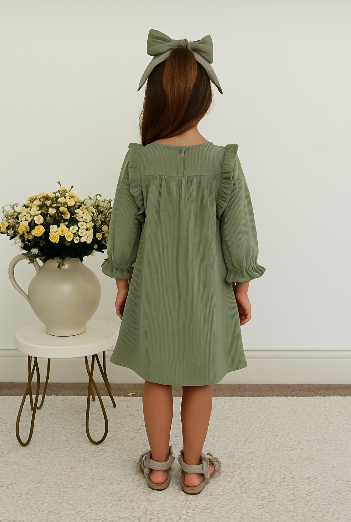 Wrinkled Cotton Long puffed sleeves Floral Dress 1-6 Y (Olive Green)